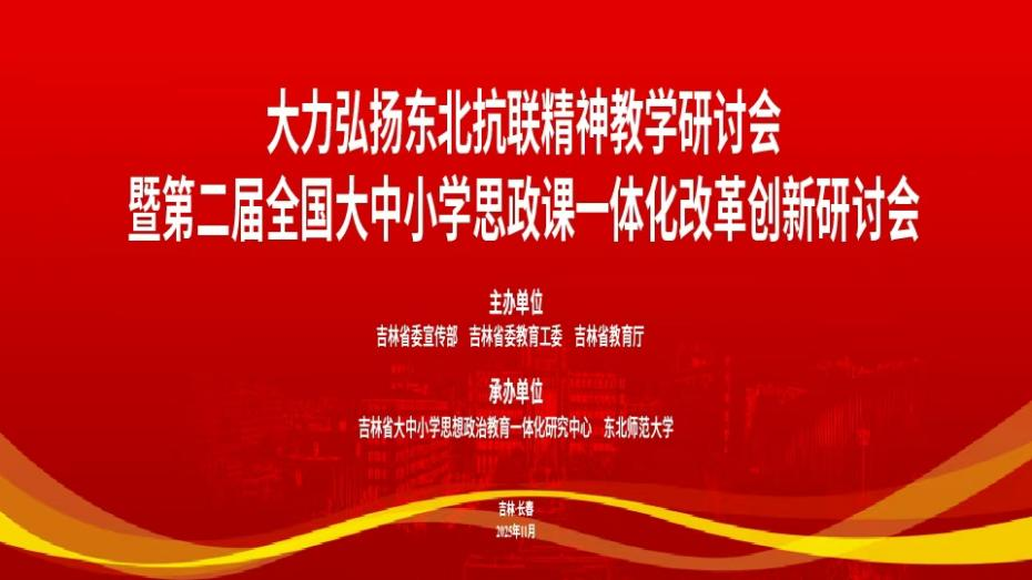 11月19日,“大力弘扬东北抗联精神教学研讨会暨第二届全国大中小学思政课一体化改革创新研讨会”在我校举行。本次研讨会由吉林省委宣传部、吉林省委教育工委、吉林省教育厅主办,东北师范大学(省大中小学思想政治教育一体化研究中心)承办。 吉林省委、省政府、省委宣传部、省委教育工委、省教育厅主要负责同志及分管负责同志,省内各高校教育工作者和专家学者汇聚一堂,重点围绕东北抗联精神融入大中小学思政课的实践...