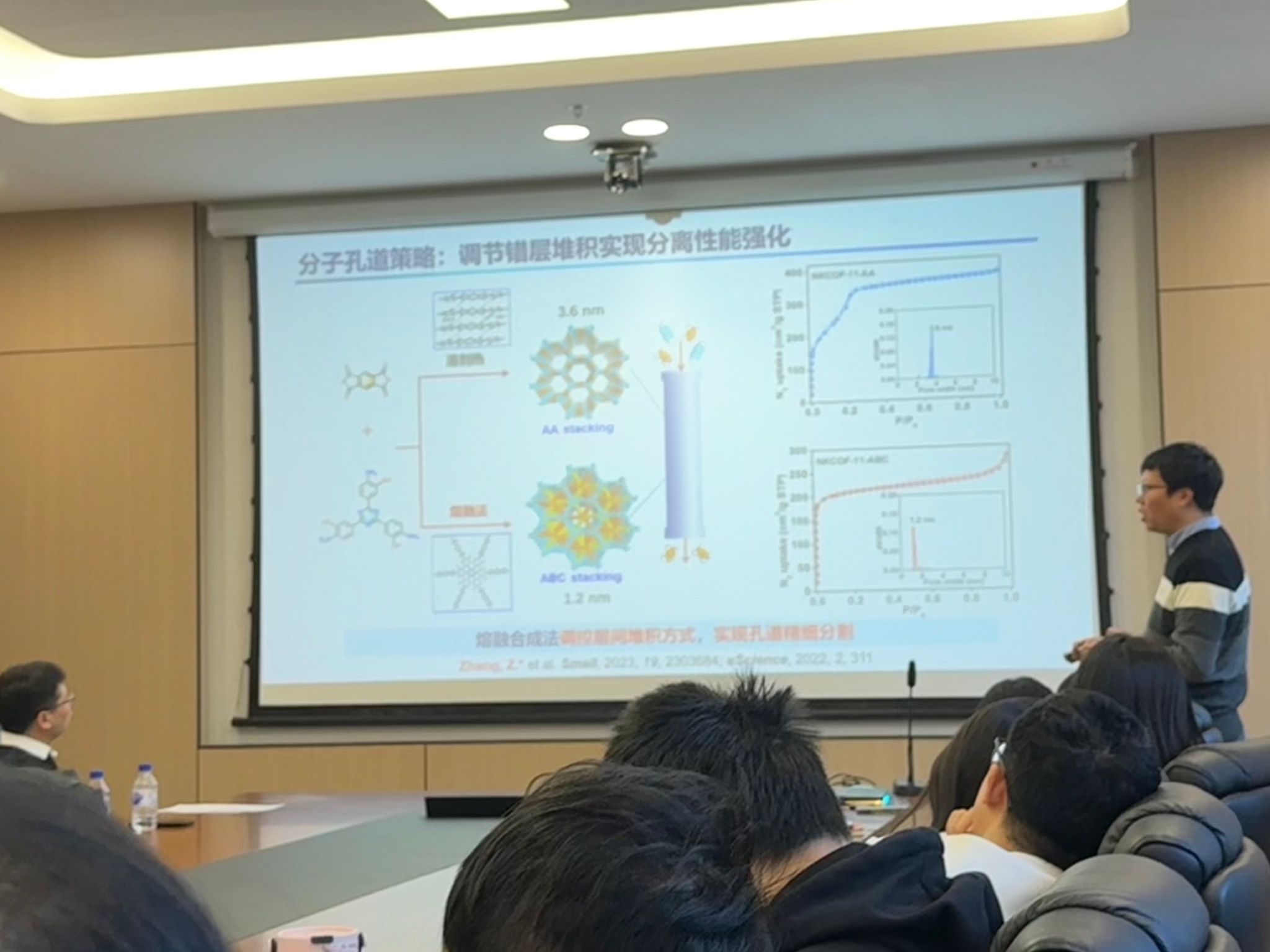张振杰教授首先以"COF均孔树脂熔融合成与应用"为题作了报告。他在报告中指出,具有均一且可调孔尺寸的COF均孔树脂材料在吸附分离性能方面具有突破性潜力,不仅能够显著提升吸附选择性和容量,还能在极端环境下保持优异稳定性。随后,徐立强教授以"碱金属/硫二次电池新型电极材料的设计与构效关系研究"为主题展开报告。他系统阐述了新型碱金属/硫二次电池的研究进展,重点介绍了其团队在普鲁士蓝基钠离子电池正极材料方面的创新突破,以及构建的本征稳定性优异的钠离子/锂硫电池新体系。徐立强教授还分享了其团队在Chemical Society Reviews、Journal of the American Chemical Society等权威期刊上发表的重要研究成果。