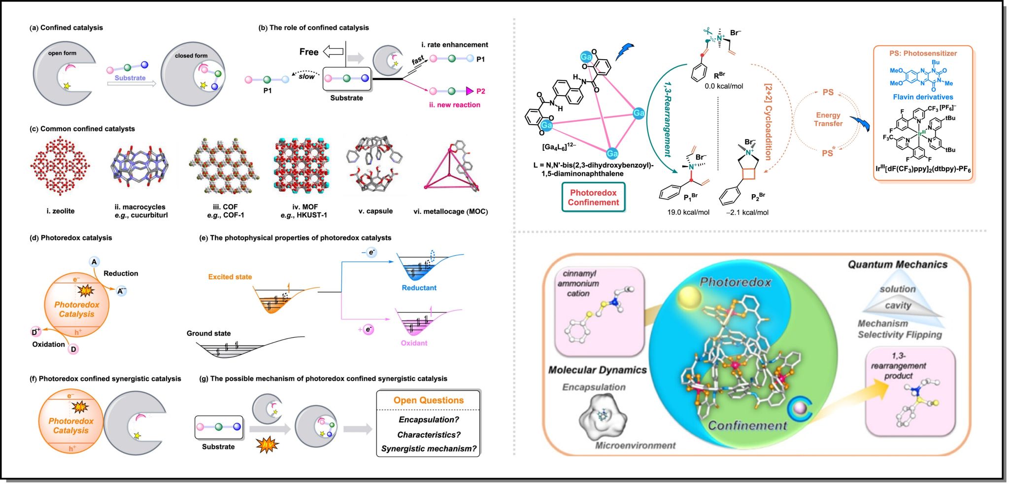 在此基础上,研究团队进一步通过分子动力学与量子化学计算揭示了光氧化还原反应在[Ga₄L₆]¹²⁻金属笼体中的电子转移与中间体稳定机理,发现限域空间可显著改变激发态电子分布并控制反应路径,首次实现了限域条件下光诱导重排反应的可控性。该成果提出了光—限域协同催化新策略,为复杂光催化反应提供了可设计的理论框架。相关成果以“Metallocage Photoredox Confined Synergistic Catalysis on 1,3-Rearrangement Reaction”为题,发表在 ACS Catalysis《催化》上。我校化学学院博士研究生王爽为论文第一作者,朱博副教授和关威教授为共同通讯作者。