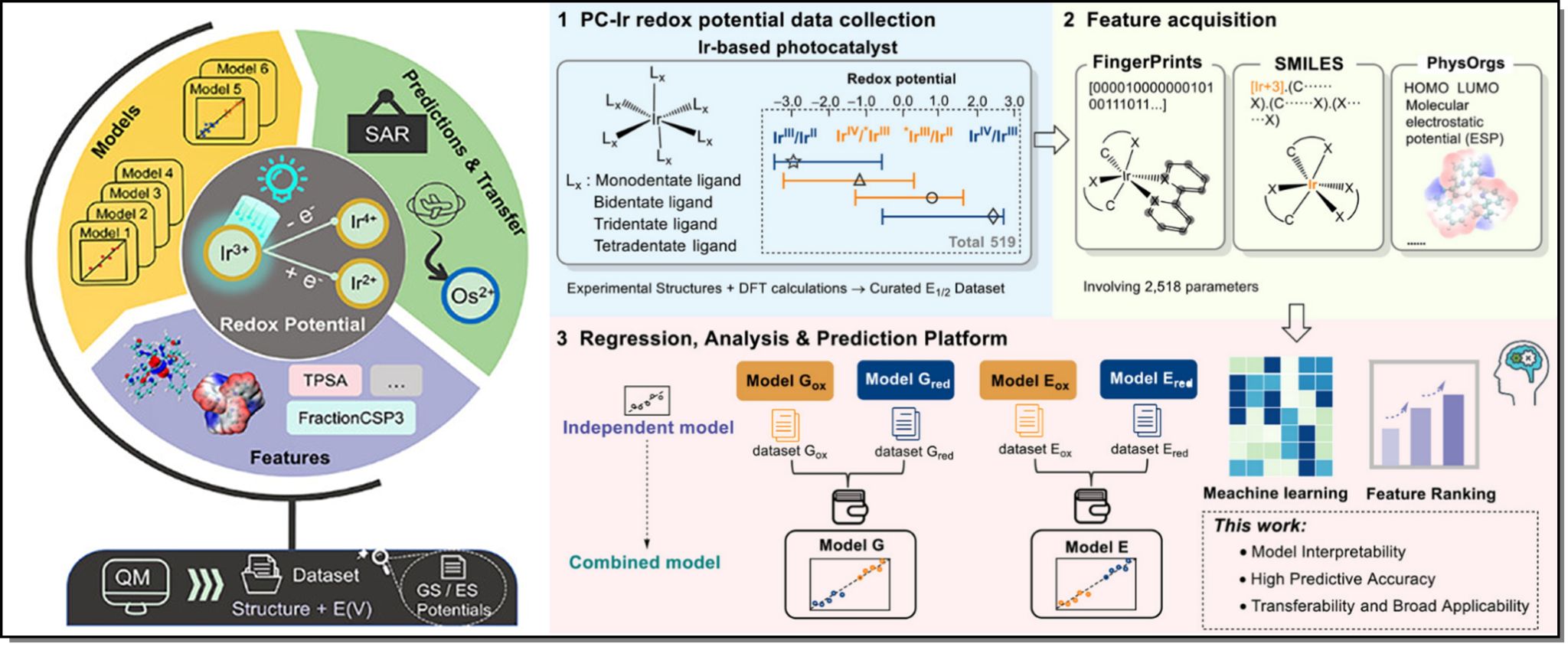 研究团队创新性地将量子化学计算与机器学习算法结合,构建了首个可解释、可迁移的光催化剂氧化还原势预测模型。本工作中,构建了覆盖519种Ir(III)光催化剂的大规模数据库,实现了基态与激发态氧化还原势的统一预测,并利用Shap可解释性分析揭示了电子结构与氧化还原活性间的定量关系。同时,团队提出残差迁移学习策略,成功实现了从Ir体系到Os体系的跨金属预测。该工作为光催化剂的高通量筛选和理性设计提供了数据驱动的新方法。相关成果以“Machine Learning-Assisted Prediction of Ground- and Excited-State Redox Potentials in Iridium(III) Photocatalysts”为题,发表在 Angewandte Chemie International Edition《德国应用化学》上。我校化学学院博士研究生李雪涛为论文第一作者,朱博副教授和关威教授为共同通讯作者。