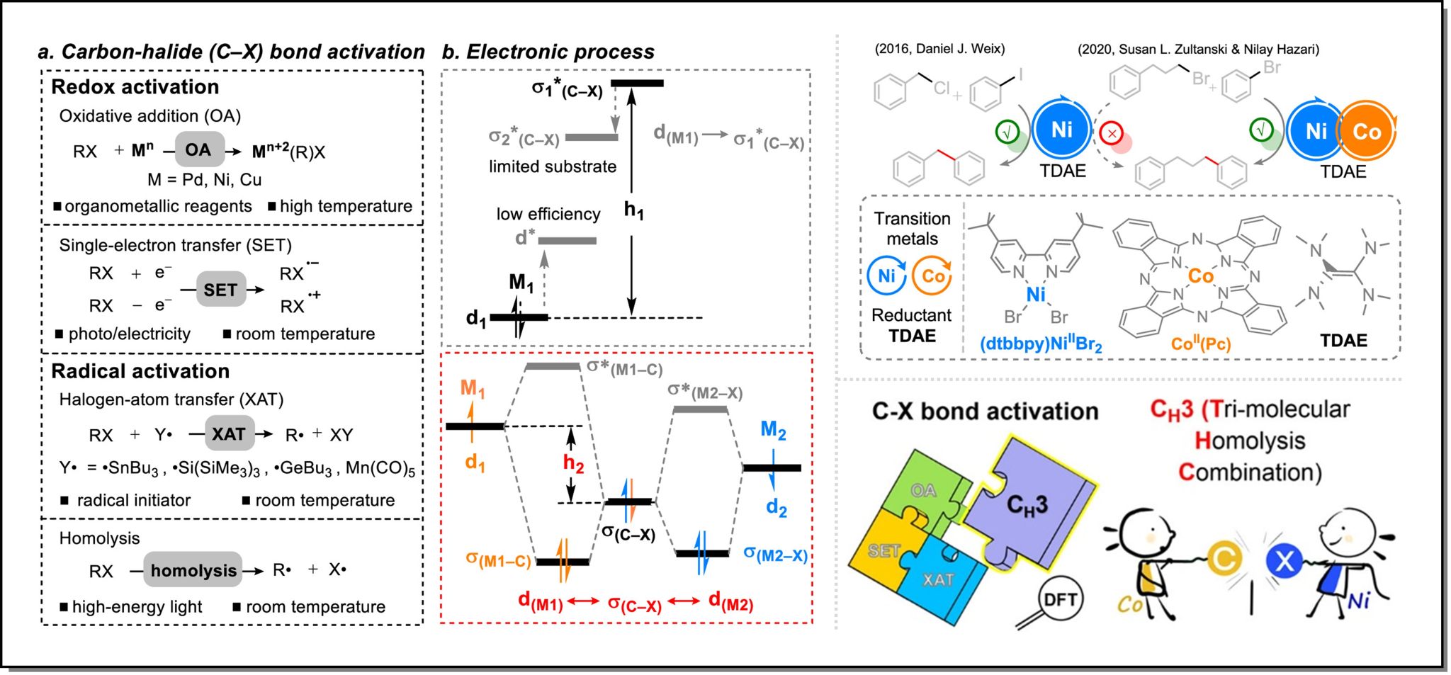 此外,研究团队聚焦于过渡金属催化自由基反应及多金属协同体系的电子调控机制,提出了“三分子均裂协同活化机制(Trimolecular Homolytic Combination Mechanism)”,揭示Ni/Co双金属协同体系中C–X键(X = Cl, Br, I)可通过σ轨道能级耦合实现惰性卤代烃的高效活化。该成果提出了多金属协同催化的新策略,为C–X键选择性断裂与反应路径调控提供了理论依据。相关研究以“Tri-Molecular Homolytic Combination Mechanism for Carbon–Halogen Bond Activation in Ni/Co Synergistic Catalysis为题,发表在 ACS Catalysis《催化》上。我校化学学院博士研究生高榕婉为论文第一作者,朱博副教授和关威教授为共同通讯作者。
