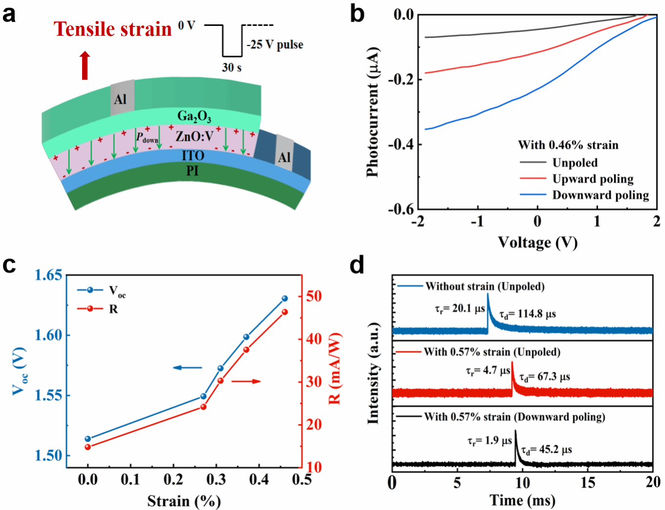 研究团队设计了基于Ga2O3/ZnO:V异质结的自供电日盲紫外探测器,利用压电效应和铁电极化协同增强了异质界面处的内建电场强度和光生载流子分离效率。该探测器在260 nm光照和零偏压下,响应度提升至64.5 mA/W、比探测率达到3.8×1010 Jones、上升/下降时间为1.9 µs/45.2 µs。相关成果以“Enhanced Performance of Self-Powered Ga2O3/ZnO:V Heterojunction Solar-Blind Ultraviolet Photodetectors by Coupling Ferroelectricity and Piezoelectricity”为题,发表在国际期刊ACS Applied Materials & Interfaces上。我校物理学院王宏彬博士后为论文的第一作者,李鹏副教授和马剑钢教授为共同通讯作者。