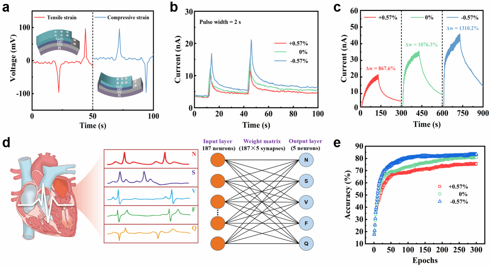 研究团队还利用非晶氧化镓(a-Ga2O3)的持续光电导现象和ZnO的压电效应,构建了柔性a-Ga2O3/ZnO异质结光电突触器件。应变诱导的压电极化场调控了异质界面处的能带弯曲和载流子动力学。在-0.57%压缩应变下,突触权重提升了22%(从1076.3%变化到1310.2%)。利用该器件,研究团队实现了对心电图(ECG)模式的识别,识别准确率在应变调控下提升至83.5%。相关成果以“Ga2O3-Based Optoelectronic Synapse With Piezo/Photo-Gated Modulation for Multimodal Perception”为题,发表在国际期刊IEEE Electron Device Letters上。我校物理学院王宏彬博士后为论文的第一作者,李鹏副教授和马剑钢教授为共同通讯作者。