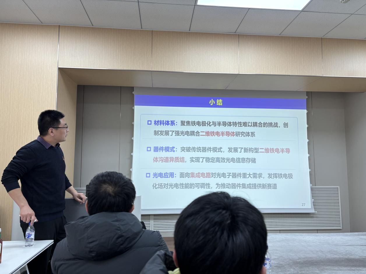 下午13时30分,论坛下半场移师惟真楼1629会议室。中科院福建物质结构研究所二级研究员、国家级高层次青年人才孙志华研究员进行了题为《二维铁电半导体材料与光电器件探索研究》的学术分享。他重点介绍了其团队在解决铁电极化与半导体性能兼容难题上的创新方法,包括对刚性骨架的精准调控和电场诱导偶极重排,并展示了由此获得的极性光电功能晶体材料及其在光电器件中的应用前景。报告内容翔实,为相关领域研究提供了新思路。