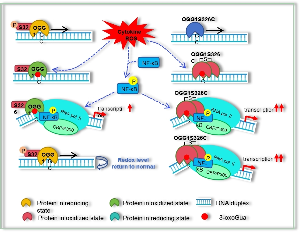 研究团队进一步深入解析了OGG1S326C变体在基因转录中的作用机制:OGG1在自然状态下就存在多种单核苷酸多态(single nucleotide polymorphic, SNP)。其中,第326等位丝氨酸突变为半胱氨酸(OGG1S326C)的频率在白种人中为23%至41%,在亚洲人中高达40%至60%,与147种疾病有关。该研究揭示了OGG1S326C携带个体易感肺炎的内在机制。OGG1第326位的丝氨酸会被CDK4组成性磷酸化,保证其发挥DNA损伤修复功能。而响应炎症信号刺激时,OGG1这一位点的磷酸化需要去除才能转而发挥基因转录调控功能。相比之下,OGG1S326C不仅不需要去磷酸化,而且由于半胱氨酸(C)容易被ROS氧化而发生二聚化,使其与DNA的结合能力增强,因此极大地促进了OGG1对炎症因子和趋化因子的转录调控作用,从而加重肺部炎症。OGG1的小分子抑制剂可以显著降低炎性基因的表达和肺炎症状。该研究阐明了携带OGG1S326C变体的个体疾病易感性增加的分子基础,并提出了OGG1抑制剂在缓解炎症驱动的病理方面的治疗潜力。相关成果以“OGG1S326C variant frequent in human populations facilitates inflammatory responses due to its extended interaction with DNA substrate”为题,发表在国际著名期刊《美国国家科学院院刊》 (PNAS)上。我校分子表观遗传学教育部重点实验室韩金玲博士为该成果的第一作者,巴雪青教授为通讯作者。