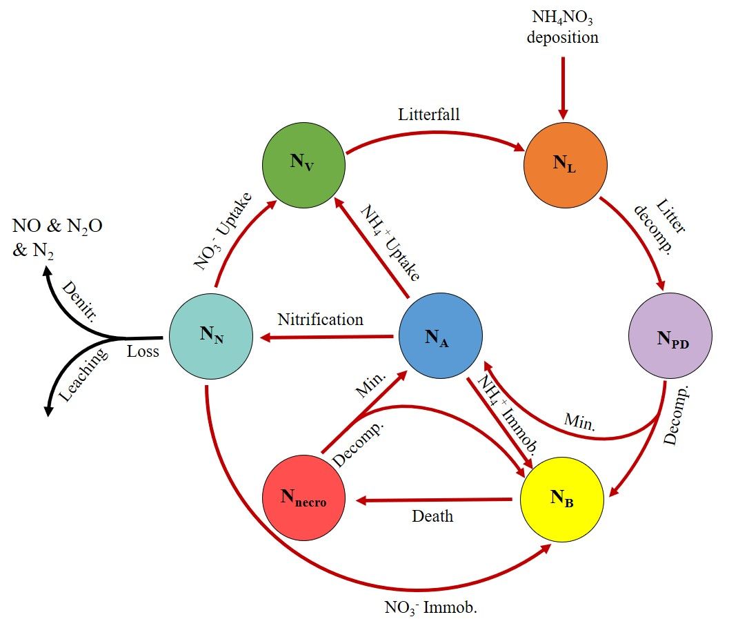研究团队利用稳定性氮同位素示踪技术,在这一领域取得重要进展。基于研究团队前期建立的温带森林氮同位素示踪平台,对生态系统各组分进行为期十年的持续监测,并建立基于过程的氮循环模型,成功确定了不同形态氮沉降在森林生态系统中的长期去向,精准量化了不同氮沉降背景下的生态系统氮利用效率和固碳潜力。