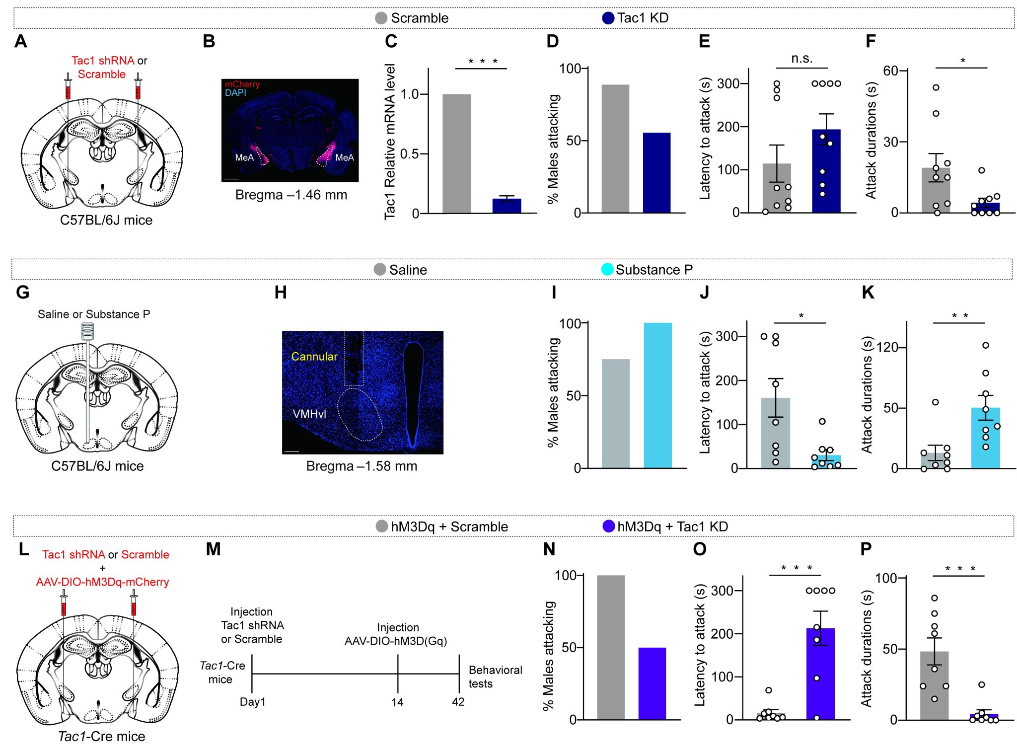 除了焦虑,攻击行为也是负性情绪的重要表现形式。作为Tac1基因最主要的表达产物,神经肽P物质在脑的负性情绪调节中具有重要功能。研究团队证明内侧杏仁核分泌的P物质对小鼠的攻击行为具有关键调控作用(图3),说明多种负面情绪在脑内可能相互关联并相互影响。相关成果以“Substance P in the medial amygdala regulates aggressive behaviors in male mice”为题,发表于国际知名学术期刊Neuropsychopharmacology,2024 Oct;49 (11):1689-1699。我校生命科学学院贺子轩副教授为论文第一作者,朱筱娟教授为通讯作者。