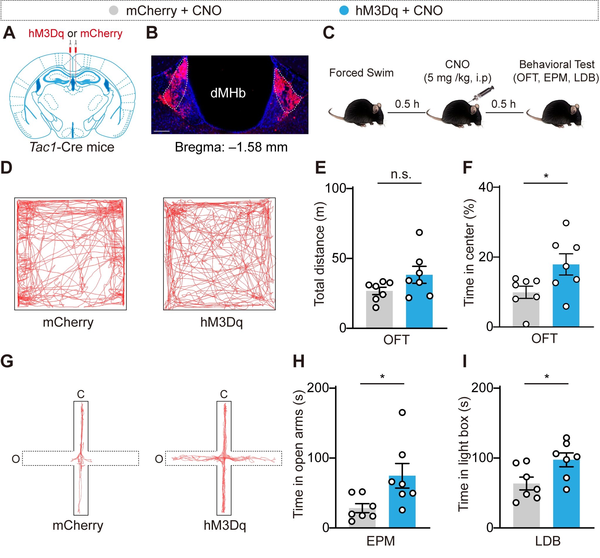 生活中压力是触发焦虑最常见的原因。团队进一步研究发现,激活内侧缰核的Tac1神经元及其所在的神经环路可以有效改善应激刺激导致的焦虑样行为(图2),为焦虑障碍相关的精神类疾病的治疗提出了新思路。相关成果以“A medial habenula neural circuit controlling anxiety-like behaviors in response to acute stress”为题,发表于国际知名学术期刊Molecular Psychiatry, 2025 Nov;30(11):5245-5254。我校生命科学学院硕士研究生王瑶和吕欣悦为论文共同第一作者,贺子轩副教授和朱筱娟教授为共同通讯作者。