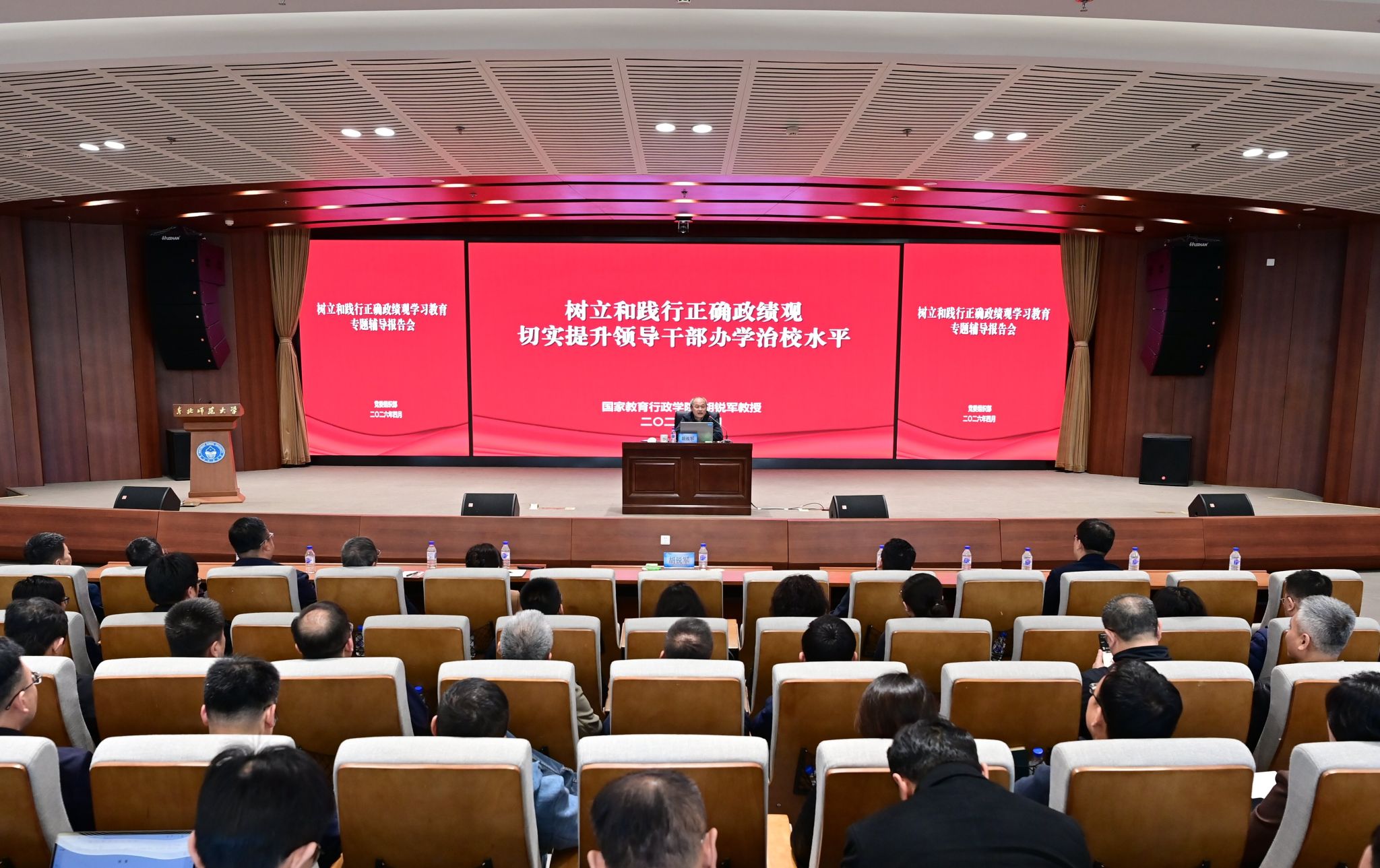 4月22日,学校中层干部树立和践行正确政绩观学习教育专题辅导报告会举行。国家教育行政学院教育行政教研部主任胡锐军教授作了题为《树立和践行正确政绩观 切实提升领导干部办学治校能力》的辅导报告。全校近300名处级干部参加了学习。