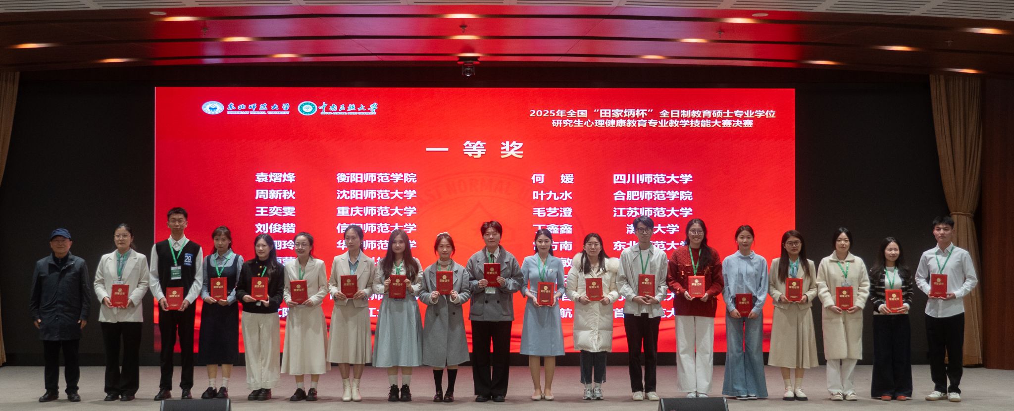 10月17日至19日,2025年全国“田家炳杯”全日制教育硕士专业学位研究生“心理健康教育”专业教学技能大赛决赛在我校举办。本次大赛在全国大赛专家委员会、心理健康教育赛项专家组指导下,由东北师范大学与中南民族大学联合主办,东北师范大学研究生院、心理学院与中南民族大学研究生院、教育学院共同承办,全国有90所学校的380位选手参赛,并有69所大学的189名选手入围决赛。大赛最终评选出一等奖18名、二等奖36名、三等奖78名,优秀教学设计奖57名,一等奖和二等奖选手的指导教师荣获“优秀指导教师”称号。我校心理学院心理健康教育专业2024级硕士研究生常方南荣获一等奖、肖湘玲荣获二等奖,王海英教授、王萍萍副教授被评为“优秀指导教师”,是我校近年来参赛取得的最好成绩。