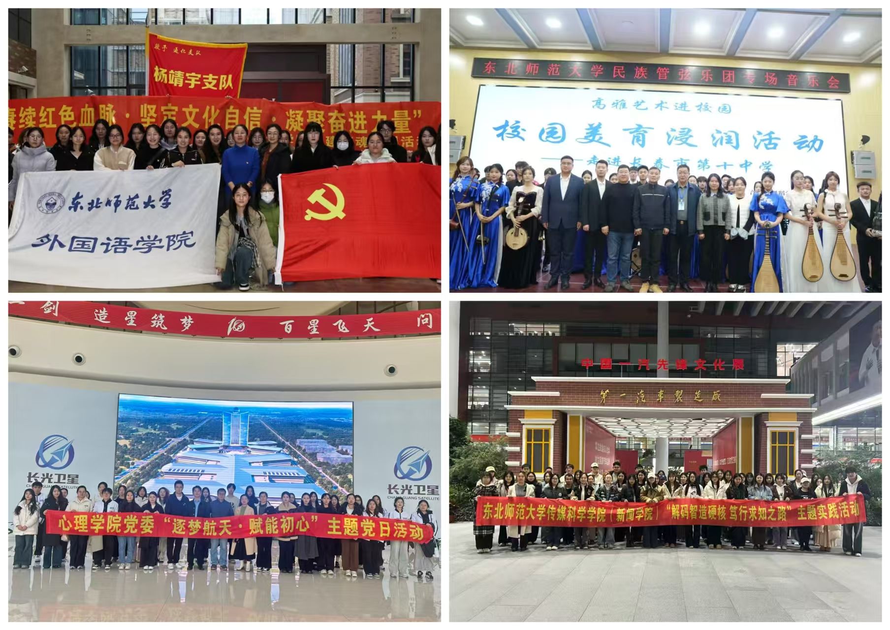 坚持实践赋能,服务国家大局。各单位立足学科优势,将党的二十届四中全会精神融入实践育人全过程,在科技创新、文化传承、服务社会等方面展现东师担当。心理学院党委组织师生党员赴长光卫星国家级航天科普教育基地开展“筑梦航天・赋能初心”主题党日活动,涵养科技素养、强化社会责任感;外国语学院党委组织师生前往吉林省近现代史展览馆开展行走党课活动,从历史中汲取奋进力量;音乐与舞蹈学院开展“艺术赋能社区”美育支教、“高雅艺术进校园”展演等活动,推动理论学习与实践育人深度融合;传媒科学学院(新闻学院)党委组织“红色传媒足迹寻访”“AIGC 赋能党建工作”等实地调研和创作研究活动,培养新时代红色传媒人才;信息科学与技术学院党委引导师生聚焦脑机接口、量子科技、网络安全等前沿领域,为科技强国建设贡献力量;后勤保障部围绕宿舍改善、校舍安全、节约型校园建设等任务,以“教育家”精神和“工匠”态度打造高质量后勤服务保障体系。